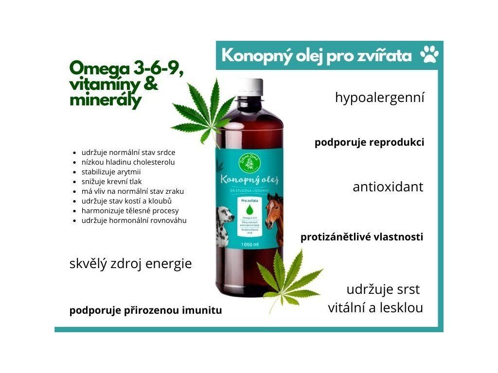Celkově konopný olej pomáhá udržovat zdravou kůži, podporuje zdraví a vitalitu srsti, harmonizuje tělesné procesy, a tím podporuje přirozenou obranyschopnost. Zároveň příznivě působí během užívání CBD pro zvířata - podporuje výsledný efekt.