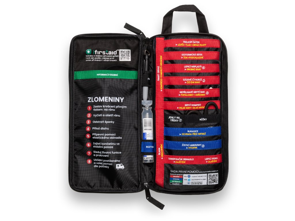Stejně jako u ostatních produktů SURVIVAL je výbava uspořádána pomocí barevně rozlišeného systému. Každá sekce má svůj jasný účel (trauma / hygiena / pomůcky / informace) a kapsy jsou přehledně popsané, takže potřebný materiál najdete rychle a bez zdržení — i když jste v terénu, pod tlakem nebo máte jen jednu volnou ruku.